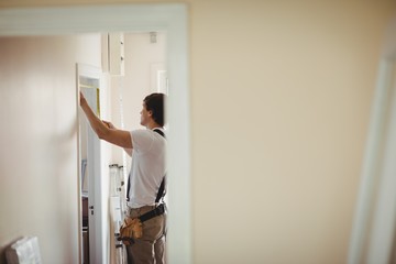 African american man leaning against glass doorframe checking smartwatch in modern office corridor