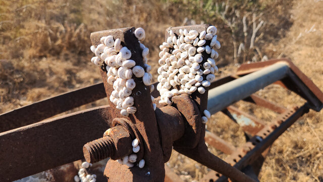 Snails (Helix sp) in estivation (summer dormancy) on rusty metal to avoid heat and dryness, sealed to the surface to conserve moisture.