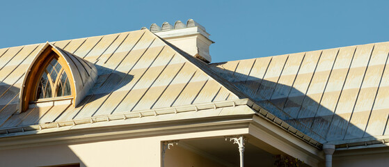 Detailed view of an old metal roof with a wooden arched dormer window and chimney, captured in warm sunlight under a clear sky.