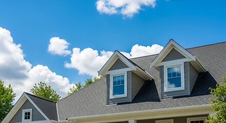 Residential house roof with dormer windows against a beautiful blue sky and fluffy white clouds