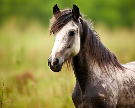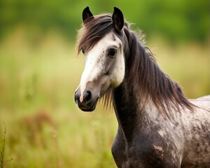 Beautiful Grullo Horse in Nature: Close-up Photo of a Fast and Majestic Equine Foal Grazing in the Green Field