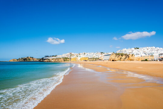 Great view of Fisherman Beach, Praia dos Pescadores, with whitewashed houses on cliff, Albufeira, Algarve, Portugal