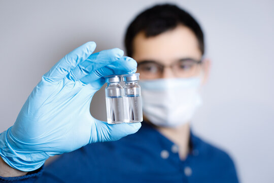 Close up photo of vaccine vials with white labels Mockup of vial bottle Concept of science vaccination and health care
