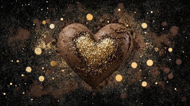 A heart-shaped chocolate cake with gold sprinkles and a dark chocolate base.