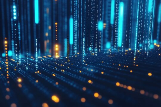 Revealing multicolor digital matrix of glowing dots and vertical bands on dark grid