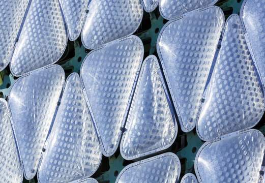 Clusters of tall thin pillars dot the coastline each one topped with a rotating device that captures energy from the tidal currents.