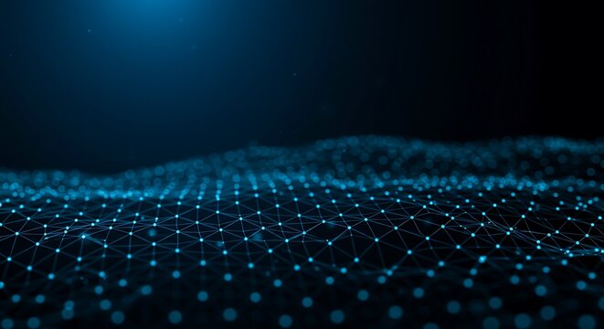 Abstract Digital Network of Glowing Blue Particles and Lines Forming a Futuristic Landscape