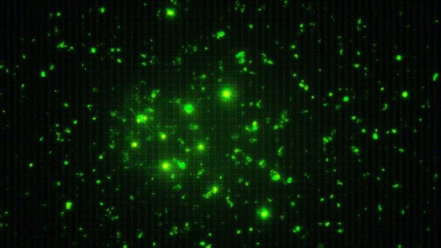 Blurry image of a line of dots with a bright orange dot in the middle. Concept of motion and energy, as if the dots are moving through space. The orange dot stands out against the blue background
