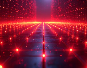 Abstract futuristic floor with rows of red illuminated dots and a hallway