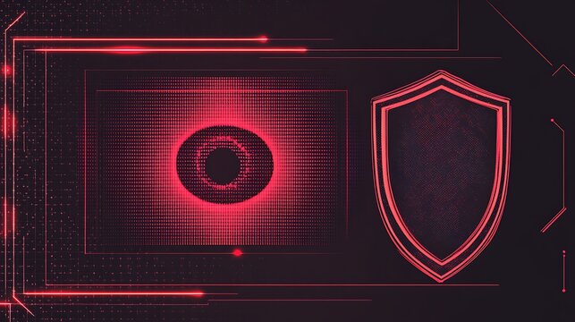 Red eye graphic with shield outline and abstract lines on a dark background
