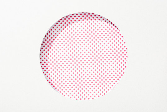 cut out round hole in white paper on pink and white dotted background
