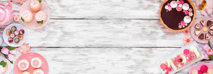 Mothers Day double border with a selection of desserts and sweets. Above view on a white wood banner background. Pink flowers theme. Copy space.