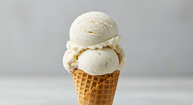 A scoop of creamy artisanal vanilla ice cream served in a waffle cone with visible texture, standing upright against a light gray background.
