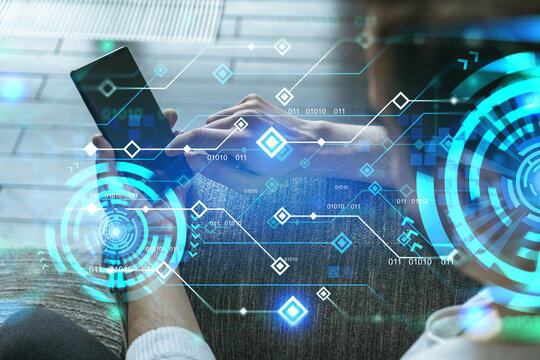 A man in casual wears, using smart phone. Double exposure. Tech theme hologram.