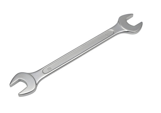 Metal double-ended wrench tool with open and boxed ends on white background, cut out