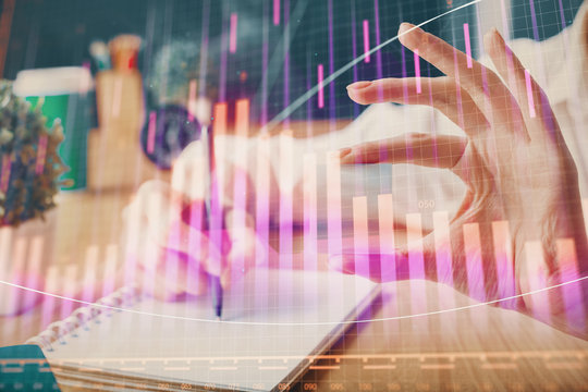 Financial graph displayed on woman's hand taking notes background. Concept of research. Multi exposure