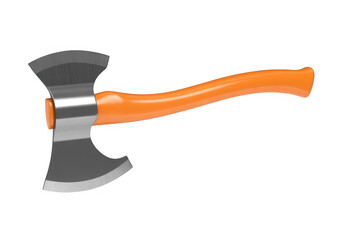 Double bladed axe with bright orange handle and polished metal head isolated on a transparent background