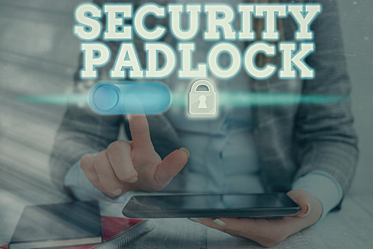 Conceptual hand writing showing Security Padlock. Concept meaning hardened steel body and double locking shackle of extra one