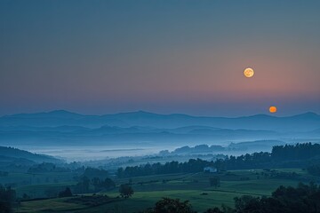 Sunrise over misty mountains with a double moon