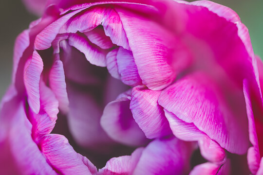 Pink-purple double tulip in bloom, petals extreme close up, full frame. Floral background, art, abstract