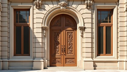 Ornate wooden double doors grace beige stone building facade. Intricate wood carvings adorn grand entranceway, framed by classical architectural details. Two windows flank doors, casting shadows on