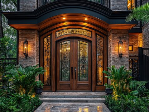 Photo white double doors with glass panes leading to the entranceway, in a church setting, front door view, beautiful, ornate, and symmetrical.