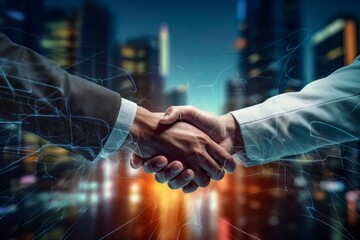 Investor. double exposure image of investor business man handshake with partner for successful meeting deal with during sunrise and cityscape background, investment, partnership, teamwork concept