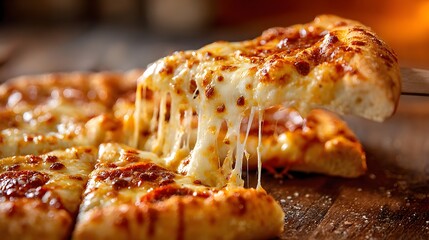 Melted cheese stretches decadently from a freshly cut slice of baked dough topped with tomato sauce