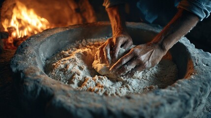 Hands press a rolling pin into a mound of dough on a floured wooden surface, with flour dust floating in the air