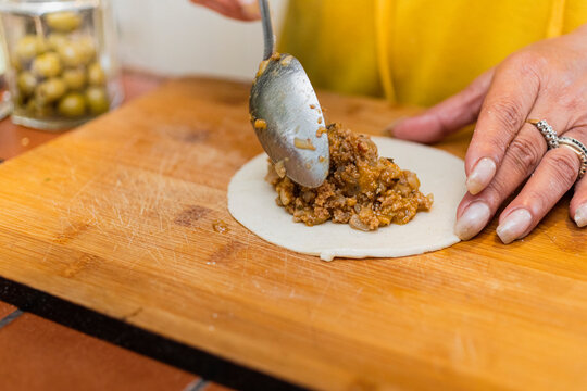A woman hand spooning food into a dough on a kitchen