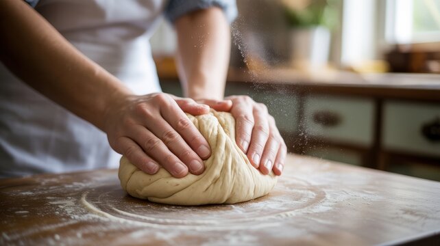 Hands kneading dough in rustic kitchen setting