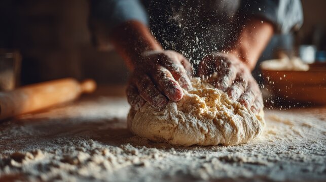A baker kneads dough in a rustic kitchen, surrounded by flour dust and fresh bread, capturing the essence of culinary tradition.