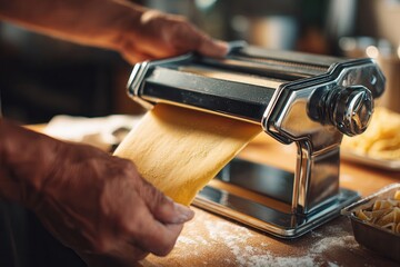 hands feeding fresh pasta dough sheet through stainless steel pasta machine