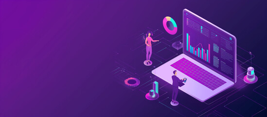 Right aligned, a visually striking 3D illustration depicts data analysis with charts/graphs and human figures interacting with a futuristic interface