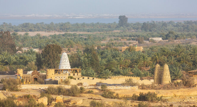 Aerial view of a traditional Egyptian dovecote made of clay, palm trees and a road. Pigeon house in Siwa oasis, Egypt