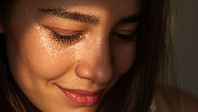 Closeup of woman gazing downward with golden glow and serene smile, natural skin texture