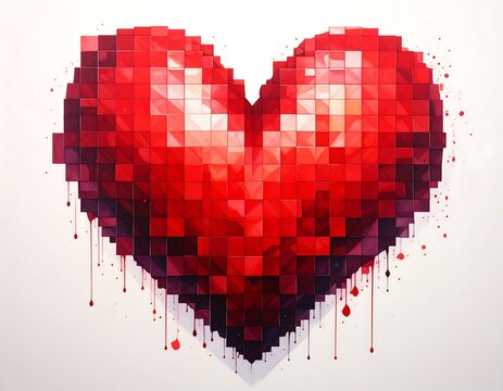 A pixelated red heart, rendered with geometric shapes, suggesting a three-dimensional form. Crimson paint drips downwards