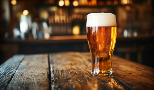 Close-up of golden beer pouring from a tap into a frosted glass in a bar, creating thick foam. Fresh draft beer, alcohol drink concept.