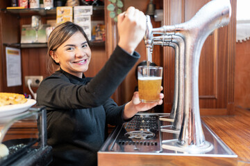 Waitress pouring cold beer in glass at restaurant bar