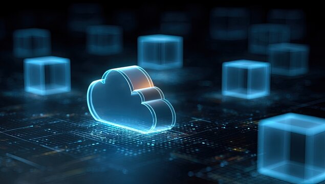 Glowing cloud icon surrounded by cube outlines on circuit pattern background