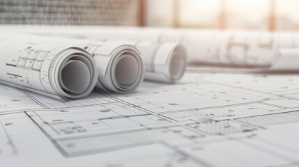 Rolled blueprints on an architect's desk, bathed in soft sun rays, symbolizing innovation and the beginning stages of a creative journey.
