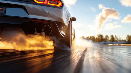 Classic muscle car burning rubber at sunset on drag strip