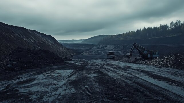 Expansive view of a coal mine with stripped earth and machinery under a cloudy sky, highlighting industrial mining operations and environmental impact