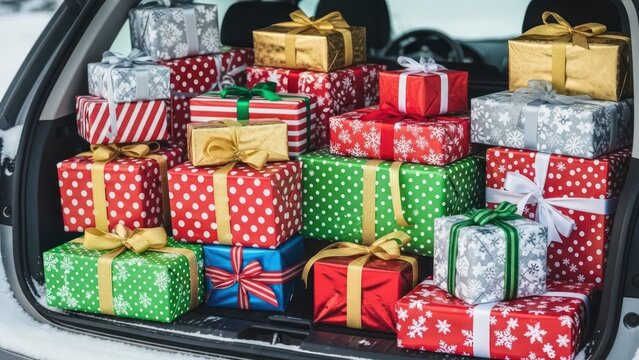 Car trunk overflowing with a festive array of wrapped Christmas presents