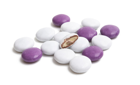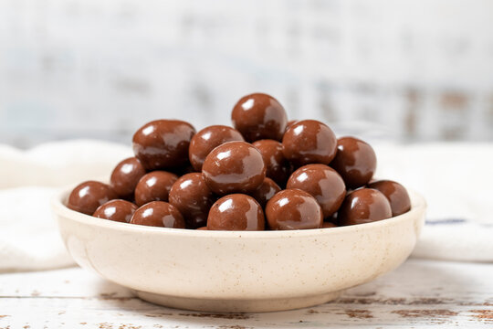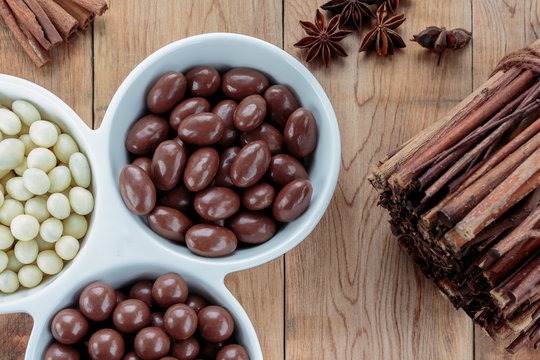 Chocolate coated hazelnut dragee. Hazelnut dragee chocolates on a white wood background. close up