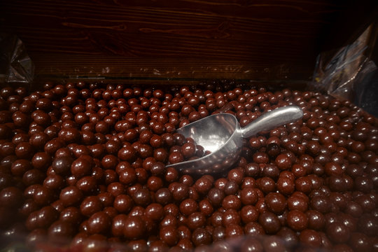 candy tray nuts in brown chocolate with metal scoop in candy store