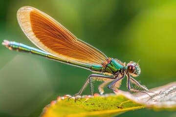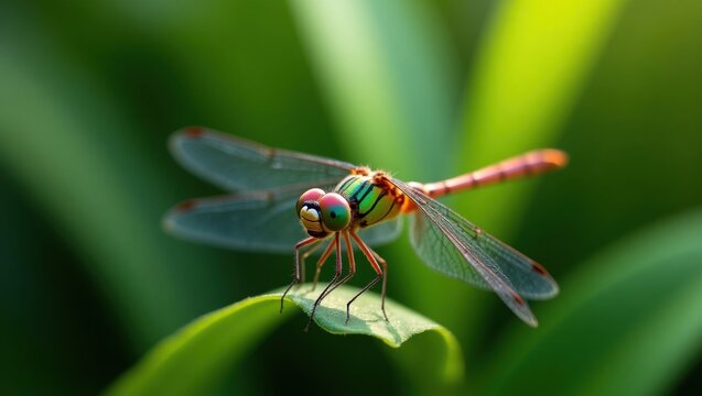 Close up of a colorful dragonfly resting on a green leaf