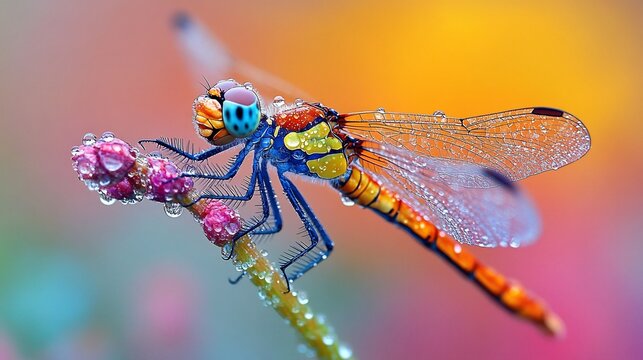 A sharp shot of a dragonfly resting on a dew covered stem at sunrise