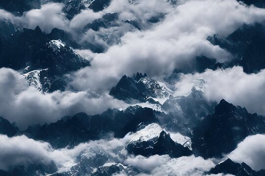 Misty jagged mountain ridge cutting through alpine clouds and swirling mist