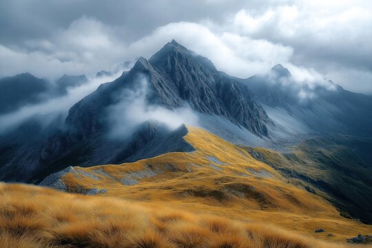Dramatic mountain peak covered in clouds. Golden grassy slopes lead to mountain base. Sky moody, dramatic. Natural scenery with alpine feel. Stunning view from high elevation. Powerful, tranquil